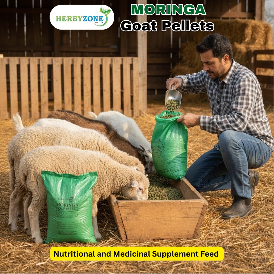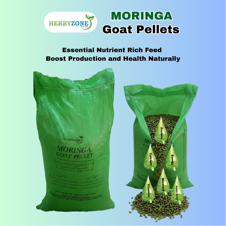 Manufactured by HERBYZONE, a trusted Moringa exporter in Pakistan, these export-quality goat pellets are suitable for daily feeding and are available for bulk supply to local and international markets, ensuring consistent quality from farm to finished product.HERBYZONE MORINGA Goat Pellets are a premium, plant-based feed supplement made from carefully selected Moringa oleifera leaves cultivated on our dedicated herbal farms in Punjab, Pakistan. These nutrient-rich pellets are designed to support healthy growth, strong immunity, improved digestion, and better productivity in both meat and dairy goats.